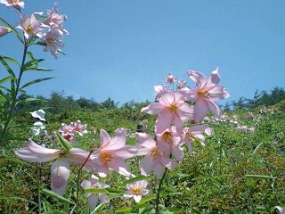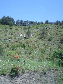 山の側面がひめさゆりとツツジに彩られ
